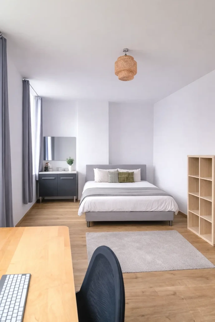 - 🪑 Entièrement meublé : lit avec sommier (possibilité de mettre un lit double), garde-robe, bureau avec chaise de bureau, étagère, frigo individuel, lavabo individuel