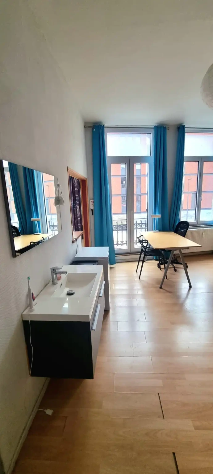 - 🪑 Entièrement meublé: lit avec sommier (possibilité de mettre un lit double), garde-robe, bureau avec chaise de bureau, étagère, frigo individuel, lavabo individuel